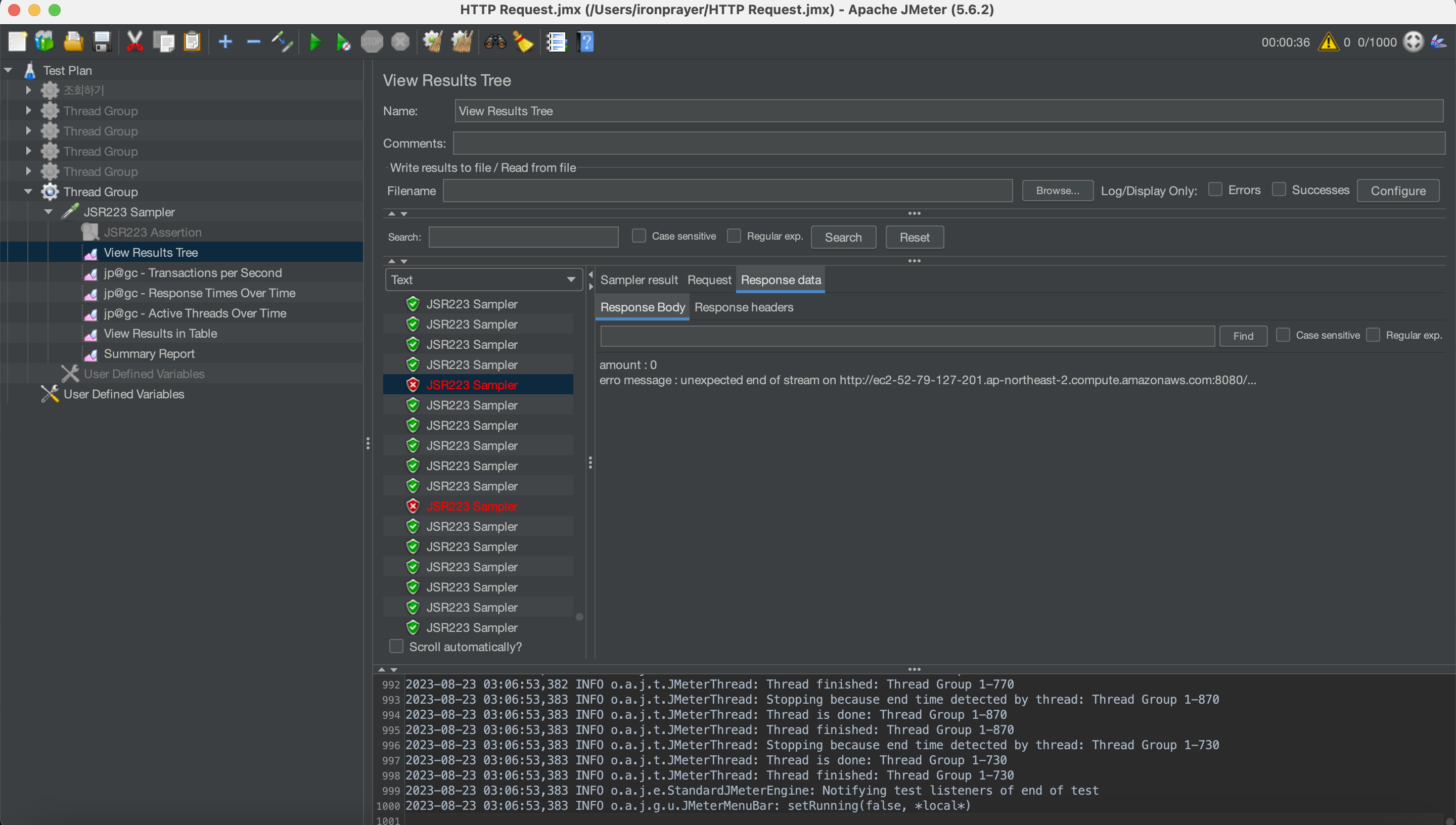 💬 Jmeter에서 서버에서 보내는 에러가 받아지는 것을 확인했습니다. 이제는 그 에러를 가지고 메시지를 출력해주려고 합니다. 결과를 실패로 변경해야 합니다.
