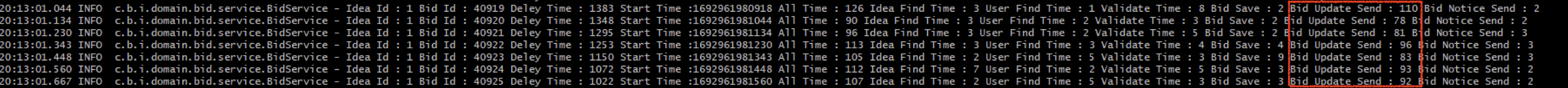💬 입찰 API에서 생기는 병목 현상을 해결하기 위해 로직을 확인했습니다. 로직의 중요 부분의 수행 시간을 측정하고 로그를 찍어서 확인했습니다.