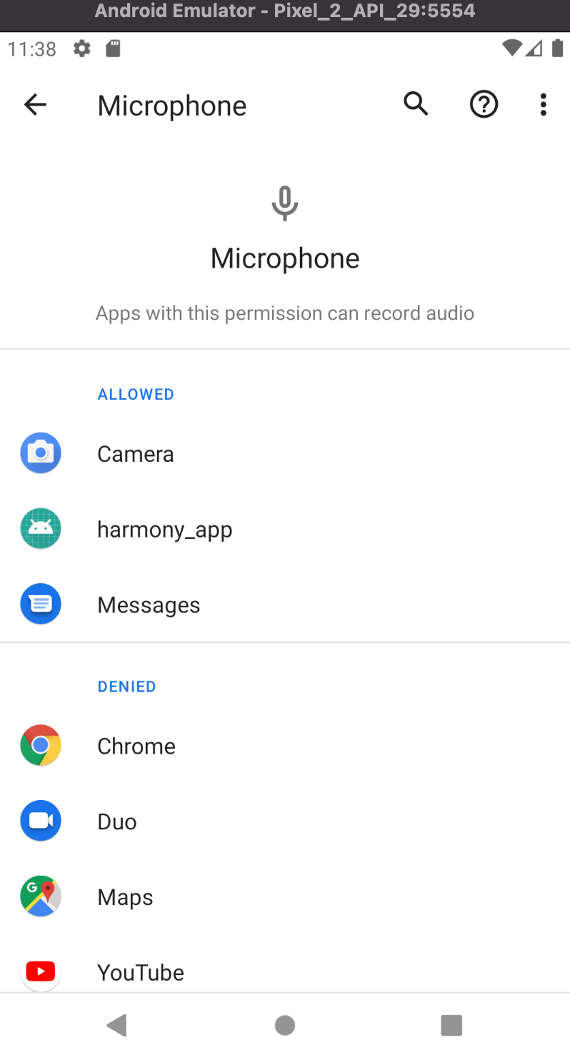 Permission manager에서 Microphone 권한 설정 창에 들어가 harmony_app을 DENIED에서 ALLOWED 상태로 변경했다. 이후 음성 녹음 기능 테스트를 했고, 소스에는 never_ask_again면서 deined 상태일 경우 이전 화면으로 돌아가는 코드를 추가했다.